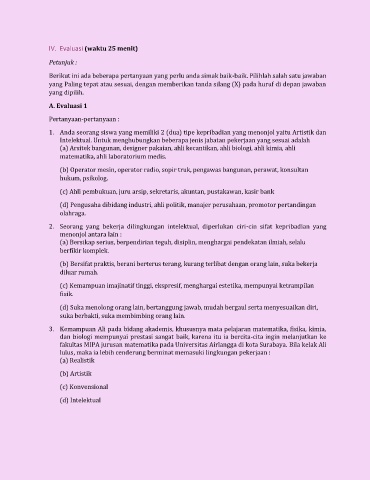 1. Anda seorang siswa yang memiliki 2 (dua) tipe kepribadian yang menonjol yaitu Artistik dan