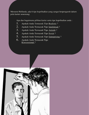 Menurut Hollands, ada 6 tipe kepribadian yang sangat berpengaruh dalam