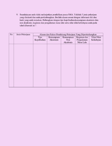 9. Seandainyan anda tidak melanjutkan pendidikan pasca SMA. Tulislah 3 jenis pekerjaan
