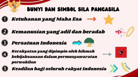 Bunyi dan simbol Sila Pancasila Ketuhanan yang Maha Esa Kemanusian yang adil dan beradab Persatuan Indonesia Kerakyatan yang dipimpin oleh hikmah kebijaksanaan dalam permusyawaratan perwakilan Keadilan bagi seluruh rakyat Indonesia