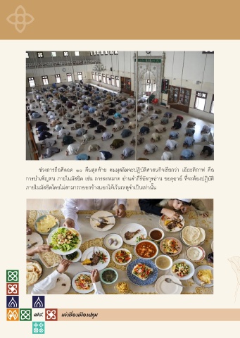 ช่วงการถือศีลอด ๑๐ คืนสุดท้าย คนมุสลิมจะปฏิบัติศาสนกิจเรียกว่า เอียะติกาฟ คือ การบําเพ็ญตน ภายในมัสยิด เช่น การละหมาด อ่านคําภีร์อัลกุรอ่าน ขอดุอาอ์ ที่จะต้องปฏิบัติ ภายในมัสยิดโดยไม่สามารถออกข้างนอกได้เว้นเหตุจําเป็นเท่านั้น ๗๔ เล่าเรื่องเมืองปทุม