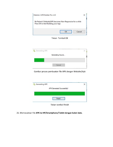 Tekan Tombol OK Gambar proses pembuatan file APK dengan Website2Apk Tekan tombol Finish 26. Memasukkan file APK ke HP/Smartphone/Tablet dengan kabel data.