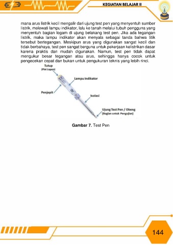 mana arus listrik kecil mengalir dari ujung test pen yang menyentuh sumber
