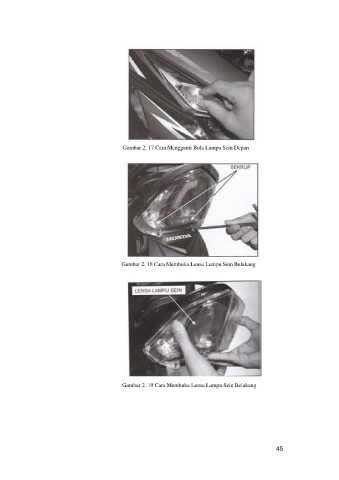 Gambar 2. 17 Cara Mengganti Bola Lampu Sein Depan Gambar 2. 18 Cara Membuka Lensa Lampu Sein Belakang Gambar 2. 19 Cara Membuka Lensa Lampu Sein Belakang 45