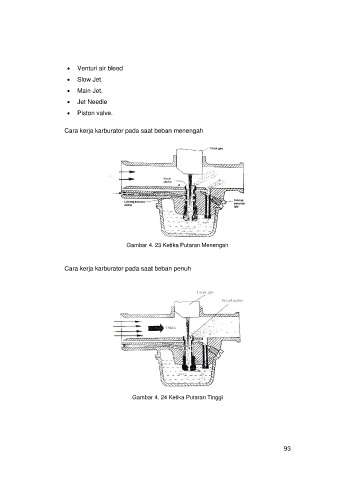 Venturi air bleed Slow Jet. Main Jet. Jet Needle Piston valve. Cara kerja karburator pada saat beban menengah Gambar 4. 23 Ketika Putaran Menengah Cara kerja karburator pada saat beban penuh Gambar 4. 24 Ketika Putaran Tinggi 93