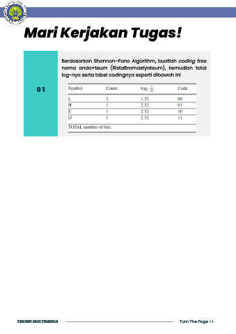 Mari Kerjakan Tugas! Berdasarkan Shannon–Fano Algorithm, buatlah coding tree nama anda+teum (RistaBramastyateum), kemudian total log-nya serta tabel codingnya seperti dibawah ini 0 1 TEKNIK MULTIMEDIA Turn The Page >>
