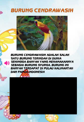 BURUNG CENDRAWASIH BURUNG CENDRAWASIH ADALAH SALAH SATU BURUNG TERINDAH DI DUNIA SEHINGGA BANYAK YANG MENAMAKANNYA SEBAGAI BURUNG SYURGA. BURUNG INI BANYAK TERDAPAT DI PULAU KALIMANTAN DAN PAPUA INDONESIA