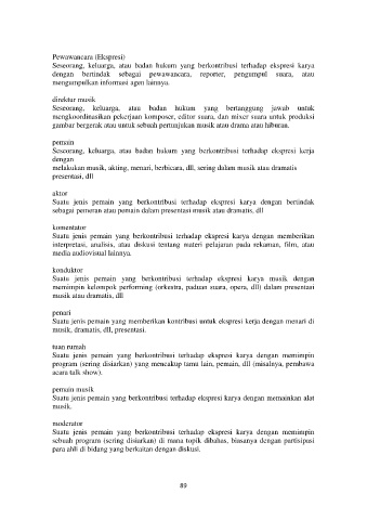 sebagai pemeran atau pemain dalam presentasi musik atau dramatis, dll