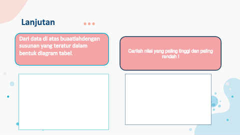 Lanjutan Dari data di atas buaatlahdengan susunan yang teratur dalam Carilah nilai yang paling tinggi dan paling bentuk diagram tabel. rendah !