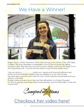 Megan Bauer, a Driver Examiner II from Rock Spring, is the winner of the CPS Video