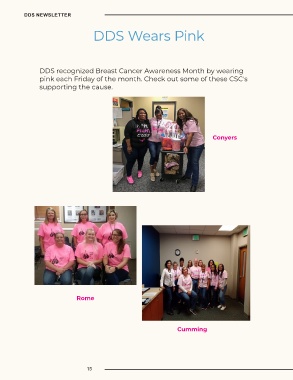 DDS NEWSLETTER DDS Wears Pink DDS recognized Breast Cancer Awareness Month by wearing pink each Friday of the month. Check out some of these CSC's supporting the cause. Conyers Rome Cumming 15