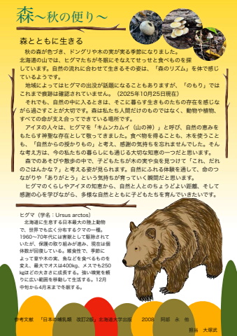 %u68ee%uff5e%u79cb%u306e%u4fbf%u308a%uff5e%u53c2%u8003%u6587%u732e%u3000%u300c%u65e5%u672c%u306e%u54fa%u4e73%u985e%u3000%u6539%u8a022%u7248%u300d%u5317%u6d77%u9053%u5927%u5b66%u51fa%u7248%u3000%u30002008 %u3000%u963f%u90e8%u3000%u6c38%u3000%u4ed6%u68ee%u3068%u3068%u3082%u306b%u751f%u304d%u308b %u79cb%u306e%u68ee%u304c%u8272%u3065%u304d%u3001%u30c9%u30f3%u30b0%u30ea%u3084%u6728%u306e%u5b9f%u304c%u5b9f%u308b%u5b63%u7bc0%u306b%u306a%u308a%u307e%u3057%u305f%u3002 %u5317%u6d77%u9053%u306e%u5c71%u3067%u306f%u3001%u30d2%u30b0%u30de%u305f%u3061%u304c%u51ac%u7720%u306b%u305d%u306a%u3048%u3066%u305b%u3063%u305b%u3068%u98df%u3079%u3082%u306e%u3092%u63a2%u3057%u3066%u3044%u307e%u3059%u3002%u81ea%u7136%u306e%u6d41%u308c%u306b%u5408%u308f%u305b%u3066%u751f%u304d%u308b%u305d%u306e%u59ff%u306f%u3001%u300c%u68ee%u306e%u30ea%u30ba%u30e0%u300d%u3092%u4f53%u3067%u611f%u3058%u3066%u3044%u308b%u3088%u3046%u3067%u3059%u3002 %u3000%u5730%u57df%u306b%u3088%u3063%u3066%u306f%u30d2%u30b0%u30de%u306e%u51fa%u6ca1%u304c%u8a71%u984c%u306b%u306a%u308b%u3053%u3068%u3082%u3042%u308a%u307e%u3059%u304c%u3001%u300c%u306e%u3082%u308a%u300d%u3067%u306f%u3053%u308c%u307e%u3067%u75d5%u8de1%u306f%u78ba%u8a8d%u3055%u308c%u3066%u3044%u307e%u305b%u3093%u3002%uff082025%u5e7410%u670825%u65e5%u73fe%u5728%uff09 %u3000%u305d%u308c%u3067%u3082%u3001%u81ea%u7136%u306e%u4e2d%u306b%u5165%u308b%u3068%u304d%u306f%u3001%u305d%u3053%u306b%u66ae%u3089%u3059%u751f%u304d%u3082%u306e%u305f%u3061%u306e%u5b58%u5728%u3092%u611f%u3058%u306a%u304c%u3089%u904e%u3054%u3059%u3053%u3068%u304c%u5927%u5207%u3067%u3059%u3002%u68ee%u306f%u79c1%u305f%u3061%u4eba%u9593%u3060%u3051%u306e%u3082%u306e%u3067%u306f%u306a%u304f%u3001%u52d5%u7269%u3084%u690d%u7269%u3001%u3059%u3079%u3066%u306e%u547d%u304c%u652f%u3048%u5408%u3063%u3066%u3067%u304d%u3066%u3044%u308b%u5834%u6240%u3067%u3059%u3002 %u3000%u30a2%u30a4%u30cc%u306e%u4eba%u3005%u306f%u3001%u30d2%u30b0%u30de%u3092%u300c%u30ad%u30e0%u30f3%u30ab%u30e0%u30a4%uff08%u5c71%u306e%u795e%uff09%u300d%u3068%u547c%u3073%u3001%u81ea%u7136%u306e%u6075%u307f%u3092%u3082%u305f%u3089%u3059%u795e%u8056%u306a%u5b58%u5728%u3068%u3057%u3066%u656c%u3063%u3066%u304d%u307e%u3057%u305f%u3002%u98df%u3079%u7269%u3092%u5f97%u308b%u3053%u3068%u3082%u3001%u6728%u3092%u4f7f%u3046%u3053%u3068%u3082%u3001%u300c%u81ea%u7136%u304b%u3089%u306e%u6388%u304b%u308a%u3082%u306e%u300d%u3068%u8003%u3048%u3001%u611f%u8b1d%u306e%u6c17%u6301%u3061%u3092%u5fd8%u308c%u307e%u305b%u3093%u3067%u3057%u305f%u3002%u305d%u3093%u306a%u8003%u3048%u65b9%u306f%u3001%u4eca%u306e%u79c1%u305f%u3061%u306e%u66ae%u3089%u3057%u306b%u3082%u901a%u3058%u308b%u5927%u5207%u306a%u77e5%u6075%u306e%u4e00%u3064%u3060%u3068%u601d%u3044%u307e%u3059%u3002 %u3000%u68ee%u3067%u306e%u3042%u305d%u3073%u3084%u6563%u6b69%u306e%u4e2d%u3067%u3001%u5b50%u3069%u3082%u305f%u3061%u304c%u6728%u306e%u5b9f%u3084%u866b%u3092%u898b%u3064%u3051%u3066%u300c%u3053%u308c%u3001%u3060%u308c%u306e%u3054%u306f%u3093%u304b%u306a%uff1f%u300d%u3068%u8003%u3048%u308b%u59ff%u304c%u898b%u3089%u308c%u307e%u3059%u3002%u81ea%u7136%u306b%u3075%u308c%u308b%u4f53%u9a13%u3092%u901a%u3057%u3066%u3001%u547d%u306e%u3064%u306a%u304c%u308a%u3084%u300c%u3042%u308a%u304c%u3068%u3046%u300d%u3068%u3044%u3046%u6c17%u6301%u3061%u304c%u80b2%u3063%u3066%u3044%u304f%u77ac%u9593%u3060%u3068%u601d%u3044%u307e%u3059%u3002 %u3000%u30d2%u30b0%u30de%u306e%u304f%u3089%u3057%u3084%u30a2%u30a4%u30cc%u306e%u77e5%u6075%u304b%u3089%u3001%u81ea%u7136%u3068%u4eba%u3068%u306e%u3061%u3087%u3046%u3069%u3088%u3044%u8ddd%u96e2%u3001%u305d%u3057%u3066%u611f%u8b1d%u306e%u5fc3%u3092%u5b66%u3073%u306a%u304c%u3089%u3001%u591a%u69d8%u306a%u81ea%u7136%u3068%u3068%u3082%u306b%u5b50%u3069%u3082%u305f%u3061%u3092%u80b2%u3093%u3067%u3044%u304d%u305f%u3044%u3067%u3059%u3002%u30d2%u30b0%u30de%uff08%u5b66%u540d%uff1aUrsus arctos%uff09 %u3000%u5317%u6d77%u9053%u306b%u751f%u606f%u3059%u308b%u65e5%u672c%u6700%u5927%u306e%u9678%u4e0a%u52d5%u7269%u3067%u3001%u4e16%u754c%u3067%u3082%u5e83%u304f%u5206%u5e03%u3059%u308b%u30af%u30de%u306e%u4e00%u7a2e%u3002%u30001960%uff5e70%u5e74%u4ee3%u306b%u306f%u5bb3%u7363%u3068%u3057%u3066%u99c6%u9664%u3055%u308c%u3066%u3044%u305f%u304c%u3001%u4fdd%u8b77%u306e%u53d6%u308a%u7d44%u307f%u304c%u9032%u307f%u3001%u73fe%u5728%u306f%u500b%u4f53%u6570%u304c%u56de%u5fa9%u3057%u3066%u3044%u308b%u3002%u96d1%u98df%u6027%u3067%u3001%u5b63%u7bc0%u306b%u3088%u3063%u3066%u8349%u3084%u6728%u306e%u5b9f%u3001%u9b5a%u306a%u3069%u3092%u98df%u3079%u308b%u3082%u306e%u3092%u5909%u3048%u3001%u6700%u5927%u3067%u30aa%u30b9%u306f400kg%u3001%u30e1%u30b9%u3067%u3082250%u338f%u307b%u3069%u306e%u5927%u304d%u3055%u306b%u6210%u9577%u3059%u308b%u3002%u5f37%u3044%u55c5%u899a%u3092%u983c%u308a%u306b%u5e83%u3044%u7bc4%u56f2%u3092%u79fb%u52d5%u3057%u3066%u751f%u6d3b%u3059%u308b%u300212%u6708%u4e2d%u65ec%u304b%u30894%u6708%u672b%u307e%u3067%u51ac%u7720%u3059%u308b%u3002%u62c5%u5f53%u3000%u5927%u585a%u6b66