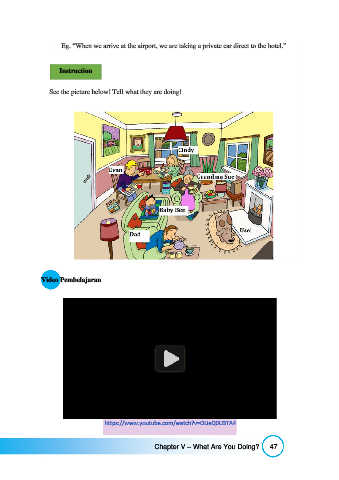 Eg. “When we arrive at the airport, we are taking a private car direct to the hotel.” Instruction ! See the picture below! Tell what they are doing! Video Pembelajaran https://www.youtube.com/watch?v=OLieQ0U3TA4 Chapter V – What Are You Doing? 47