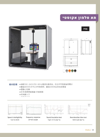 יטסוקא ןופלט יטסוקא ןופלט את את PH3 Speech intelligibility Frequency response Sound Insulation test Reverberation time test רובידה תודח םירדת תבוגת לוקה דודיב תקידב דוהדה ןמז תקידב 12 Status 12 s S t atu