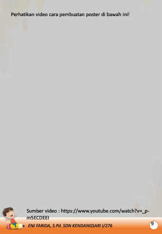 Perhatikan video cara pembuatan poster di bawah ini! Sumber video : https://www.youtube.com/watch?v=_p- m5ECDEEI 9 ENI FARIDA, S.Pd. SDN KENDANGSARI I/276