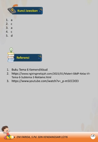 1. a 2. c 3. a 4. c 5. d 1. Buku Tema 6 Kemendikbud 2. https://www.ngiringmelajah.com/2021/01/Materi-SBdP-Kelas-VI- Tema-6-Subtema-3-Reklame.html 3. https://www.youtube.com/watch?v=_p-m5ECDEEI 14 ENI FARIDA, S.Pd. SDN KENDANGSARI I/276