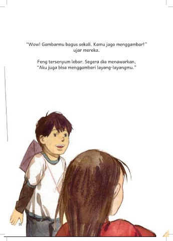 “Wow! Gambarmu bagus sekali. Kamu jago menggambar!” ujar mereka. Feng tersenyum lebar. Segera dia menawarkan, “Aku juga bisa menggambari layang-layangmu.” 26