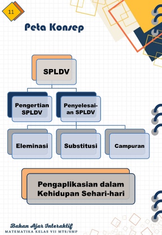 11 Peta Konsep SPLDV Pengertian Penyelesai- SPLDV an SPLDV Eleminasi Substitusi Campuran Pengaplikasian dalam Kehidupan Sehari-hari