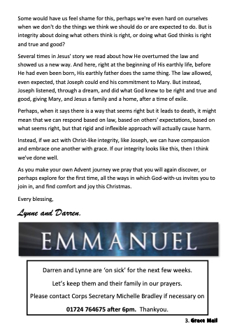 Please contact Corps Secretary Michelle Bradley if necessary on 01724 764675 after 6pm. Thankyou.