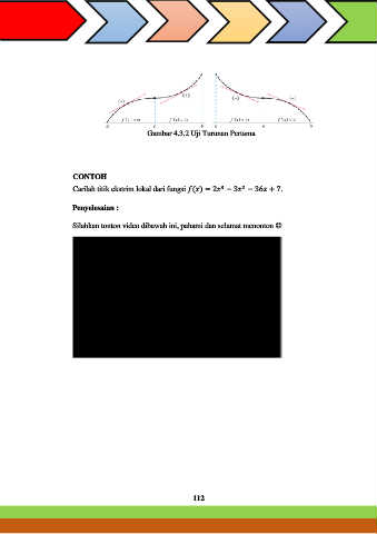 Gambar 4.3.2 Uji Turunan Pertama CONTOH Carilah titik ekstrim lokal dari fungsi ( ) = 2 − 3 − 36 + 7. 3 2 Penyelesaian : Silahkan tonton video dibawah ini, pahami dan selamat menonton 112