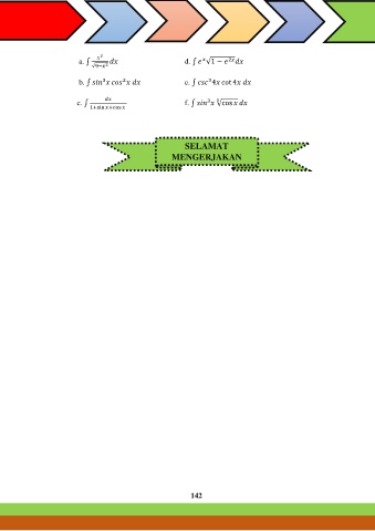 2 2 a. ∫ d. ∫ √1 − √9− 2 3 2 b. ∫ e. ∫ 4 cot 4 3 3 5 c. ∫ f. ∫ √cos 1+sin +cos SELAMAT MENGERJAKAN 142