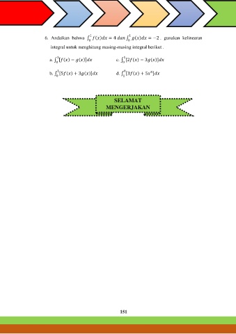 1 1 6. Andaikan bahwa ∫ ( ) = 4 ∫ ( ) = −2 . gunakan kelinearan 0 0 integral untuk menghitung masing-masing integral berikut . 1 1 a. ∫ [ ( ) − ( )] c. ∫ [2 ( ) − 3 ( )] 0 0 0 1 5 b. ∫ [5 ( ) + 3 ( )] d. ∫ [3 ( ) + 5 ] 0 1 SELAMAT MENGERJAKAN 151