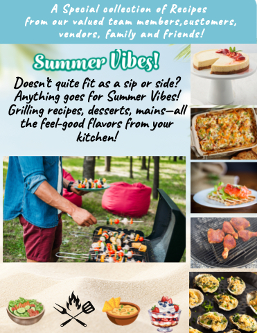 A Special collection of Recipes from our valued team members,customers, vendors, family and friends! Doesn’t quite fit as a sip or side? Anything goes for Summer Vibes! Grilling recipes, desserts, mains—all the feel-good flavors from your kitchen!