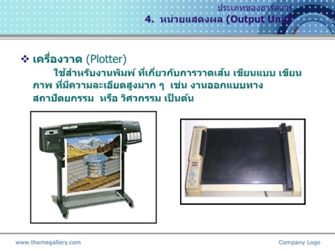 ประเภทของฮาร์ดแวร์ 4. หน่วยแสดงผล (Output Unit) เครื่องวาด (Plotter) ใช้ส าหรับงานพิมพ์ ทีเกียวกับการวาดเส้น เขียนแบบ เขียน ่ ่ ภาพ ที่มีความละเอียดสูงมาก ๆ เช่น งานออกแบบทาง สถาปัตยกรรม หรือ วิศวกรรม เปนต้น ็ www.themegallery.com Company Logo