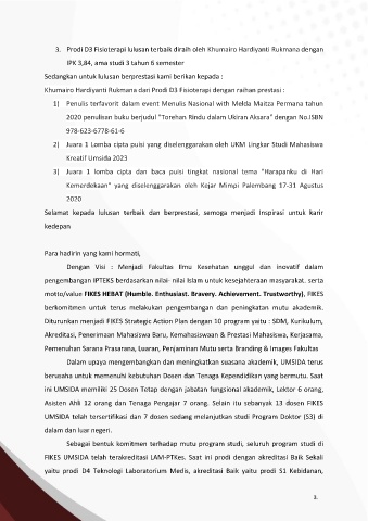 3. Prodi D3 Fisioterapi lulusan terbaik diraih oleh Khumairo Hardiyanti Rukmana dengan