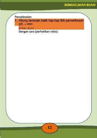 Penyelesaian: 1. Hitung lendutan balik tiap-tiap titik pemeriksaan (d) → mm d 2( d d ). f t C . 1 3 Dengan cara (perhatikan vidio): 12