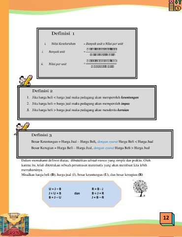 Misalkan harga beli (B), harga jual (J), besar keuntungan (U), dan besar kerugian (R)