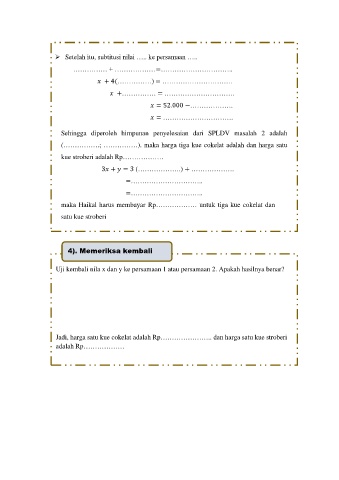 Jadi, harga satu kue cokelat adalah Rp………………….. dan harga satu kue stroberi