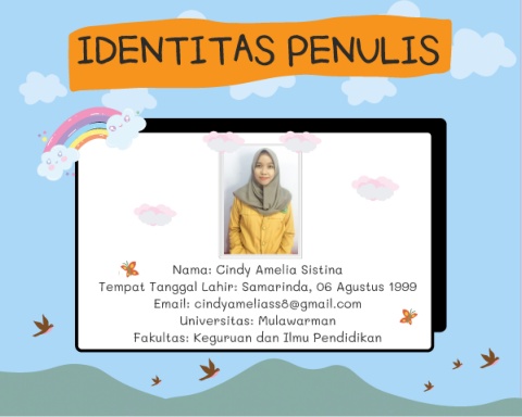 IDENTITAS PENULIS Nama: Cindy Amelia Sistina Tempat Tanggal Lahir: Samarinda, 06 Agustus 1999 Email: cindyameliass8@gmail.com Universitas: Mulawarman Fakultas: Keguruan dan Ilmu Pendidikan