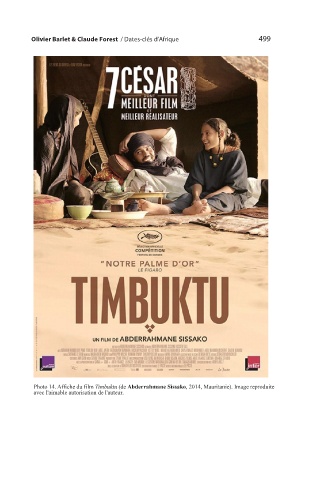 Olivier Barlet & Claude Forest / Dates-clés d’Afrique 499 Photo 14. Affiche du film Timbuktu (de Abderrahmane Sissako, 2014, Mauritanie). Image reproduite avec l'aimable autorisation de l'auteur.