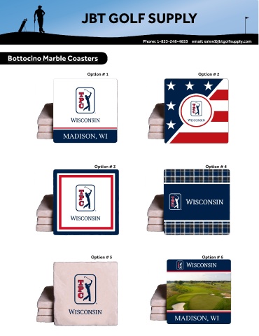 JBT GOLF SUPPLY JBT GOLF SUPPLY Phone: 1-833-248-4653 email: sales@jbtgolfsupply.com Bottocino Marble Coasters ker Option # 1 Option # 2 MADISON, WI Option # 3 Option # 4 Option # 5 Option # 6 MADISON, WI