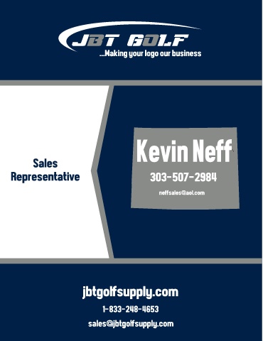 JBT Golf ...Making your logo our business Kevin Neff Sales Representative 303-507-2984 neffsales@aol.com jbtgolfsupply.com 1-833-248-4653 sales@jbtgolfsupply.com