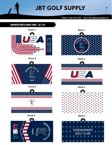 JBT GOLF SUPPLY JBT GOLF SUPPLY Phone: 1-833-248-4653 email: sales@jbtgolfsupply.com Sublimated Waffle Weave Towel - 20" x 40" Front 1 Back 1 USA GOLF CLUB EISENHOWER Front 2 Back 2 USA Front 3 Back 3 Front 4 Back 4 EISENHOWER GOLF CLUB USA