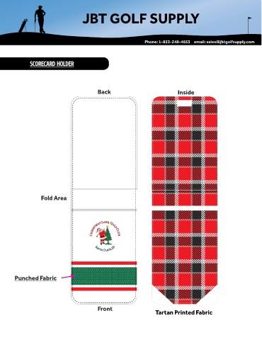 JBT GOLF SUPPLY JBT GOLF SUPPLY Phone: 1-833-248-4653 email: sales@jbtgolfsupply.com scorecard holder ok Ball Marker Back Inside Back Inside Fold Area Fold Area Punched Fabric Punched Fabric Front Front Tartan Printed Fabric Tartan Printed Fabric