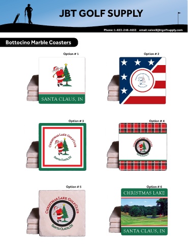 JBT GOLF SUPPLY JBT GOLF SUPPLY Phone: 1-833-248-4653 email: sales@jbtgolfsupply.com Bottocino Marble Coasters ker Option # 1 Option # 2 SANTA CLAUS, IN Option # 3 Option # 4 Option # 5 Option # 6 CHRISTMAS LAKE SANTA CLAUS, IN