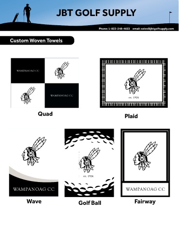 JBT GOLF SUPPLY JBT GOLF SUPPLY Phone: 1-833-248-4653 email: sales@jbtgolfsupply.com er er ker Custom Woven Towels k k WAMPANOAG CC WAMPANOAG CC Quad Plaid WAMPANOAG CC WAMPANOAG CC Wave Golf Ball Fairway