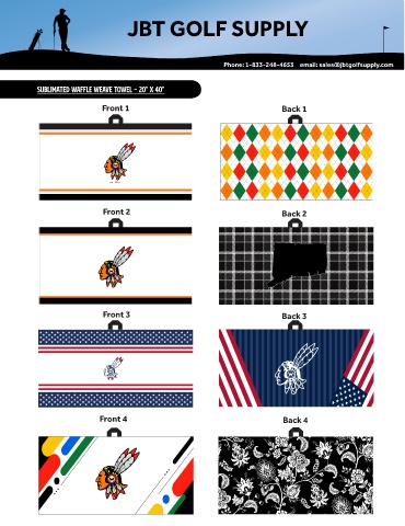 JBT GOLF SUPPLY JBT GOLF SUPPLY Phone: 1-833-248-4653 email: sales@jbtgolfsupply.com Sublimated Waffle Weave Towel - 20" x 40" Front 1 Back 1 Front 2 Back 2 Front 3 Back 3 Front 4 Back 4