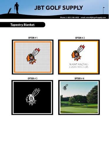 JBT GOLF SUPPLY JBT GOLF SUPPLY Phone: 1-833-248-4653 email: sales@jbtgolfsupply.com ker Tapestry Blanket Option # 1 Option # 2 WAMPANOAG COUNTRY CLUB Option # 3 Option # 4