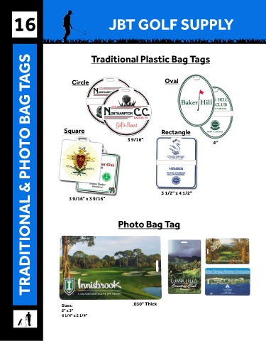 16 JBT GOLF SUPPLY AGS Circle Traditional Plastic Bag Tags Oval TRADITIONAL & PHOTO BAG T Square Rectangle 3 9/16" 4" 3 1/2" x 4 1/2" 3 9/16" x 3 9/16" Photo Bag Tag Sizes: .030" Thick 5" x 3" 4 1/4" x 2 1/4"