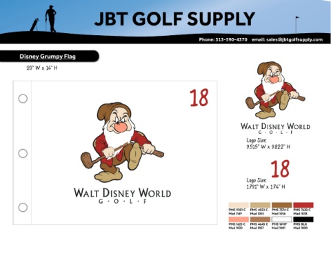 JB T GOLF SUPPL JBT GOLF SUPPLY Y Phone: 313-590-4370 email: sales@jbtgolfsupply.com Disney Grumpy Flag 20" W x 14" H 18 Logo Size: 9.515" W x 9.822" H 18 Logo Size: 1.791" W x 1.74" H