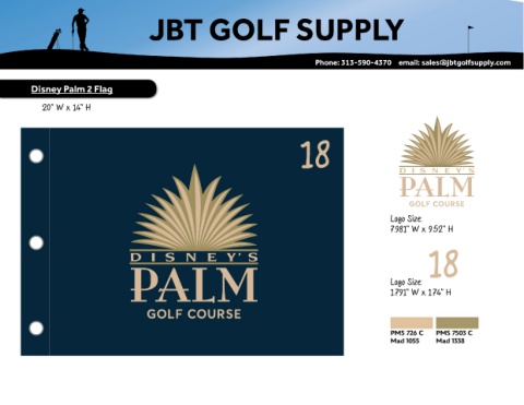 JB T GOLF SUPPL JBT GOLF SUPPLY Y Phone: 313-590-4370 email: sales@jbtgolfsupply.com Disney Palm 2 Flag 20" W x 14" H 18 Logo Size: 7.981" W x 9.52" H 18 Logo Size: 1.791" W x 1.74" H