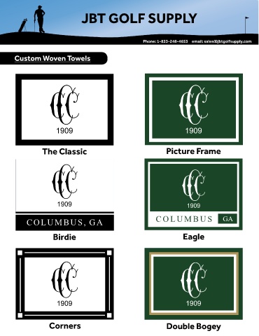 JBT GOLF SUPPLY JBT GOLF SUPPLY Phone: 1-833-248-4653 email: sales@jbtgolfsupply.com ker Custom Woven Towels The Classic Picture Frame C O L U M B U S GA COLUMBUS, GA Birdie Eagle Corners Double Bogey