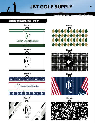 JBT GOLF SUPPLY JBT GOLF SUPPLY Phone: 1-833-248-4653 email: sales@jbtgolfsupply.com Sublimated Waffle Weave Towel - 20" x 40" Front 1 Back 1 Country Club of Columbus Front 2 Back 2 Front 3 Back 3 Country Club of Columbus Front 4 Back 4