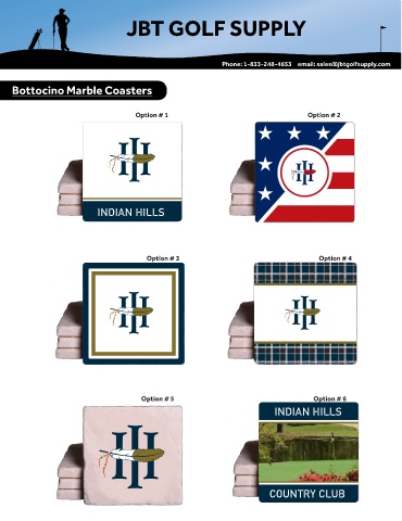 JBT GOLF SUPPLY JBT GOLF SUPPLY Phone: 1-833-248-4653 email: sales@jbtgolfsupply.com Bottocino Marble Coasters ker Option # 1 Option # 2 INDIAN HILLS INDIAN HILLS Option # 3 Option # 4 Option # 5 Option # 6 INDIAN HILLS COUNTRY CLUB