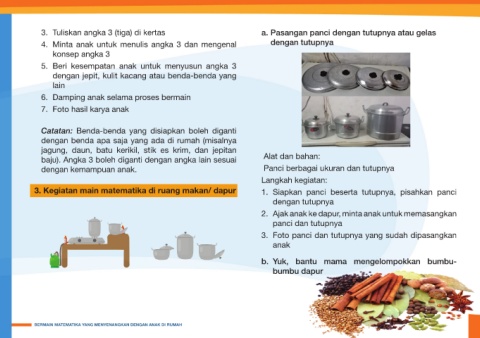 3. Kegiatan main matematika di ruang makan/ dapur 1. Siapkan panci beserta tutupnya, pisahkan panci