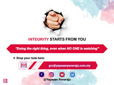 INTEGRITY STARTS FROM YOU “Doing the right thing, even when NO ONE is watching” Drop your note here: grc@yayasanpeneraju.com.my @Yayasan Peneraju